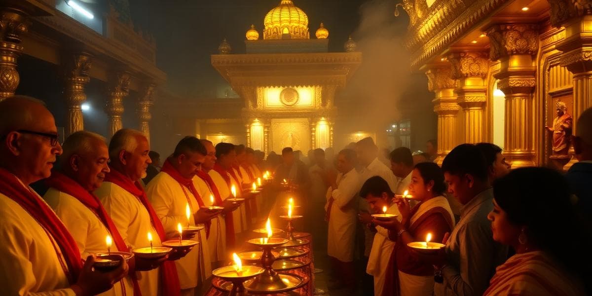 દિવસની પ્રથમ પવિત્ર વિધિ - મંત્રોચ્ચાર આને દીપકના પ્રકાશમાં મંદિરના દેવતાઓને જાગ્રત કરાય છે.